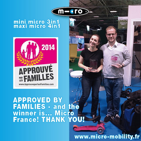 Эта награда присуждалась в 2013 году впервые. Она присуждалась на основании длительных испытаний продукции в домашних условиях французскими семьями. И компания Micro Mobility Systems не случайно стала первым номинантом этой награды - это очередное признание надежности, безопасности и долговечности самокатов Micro.