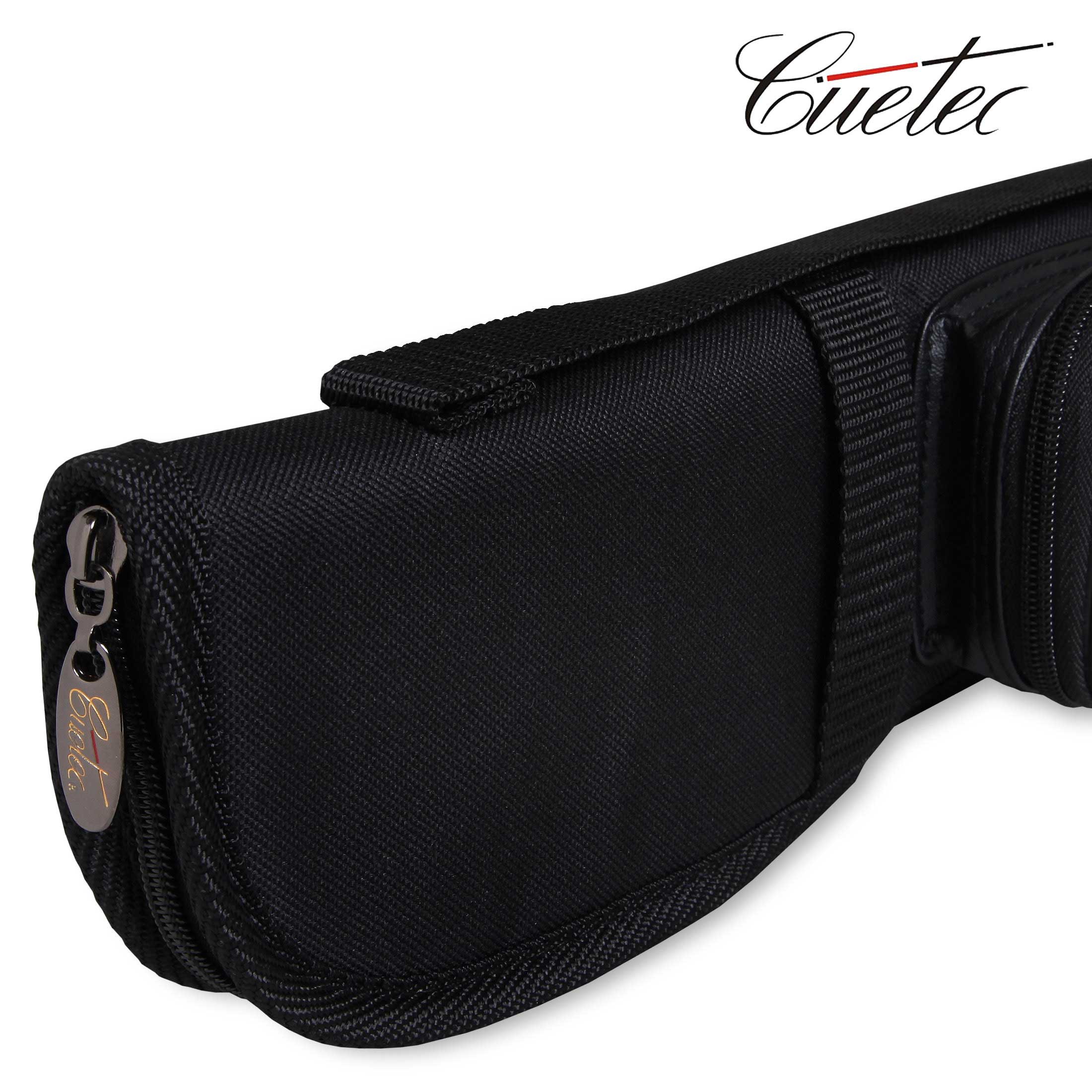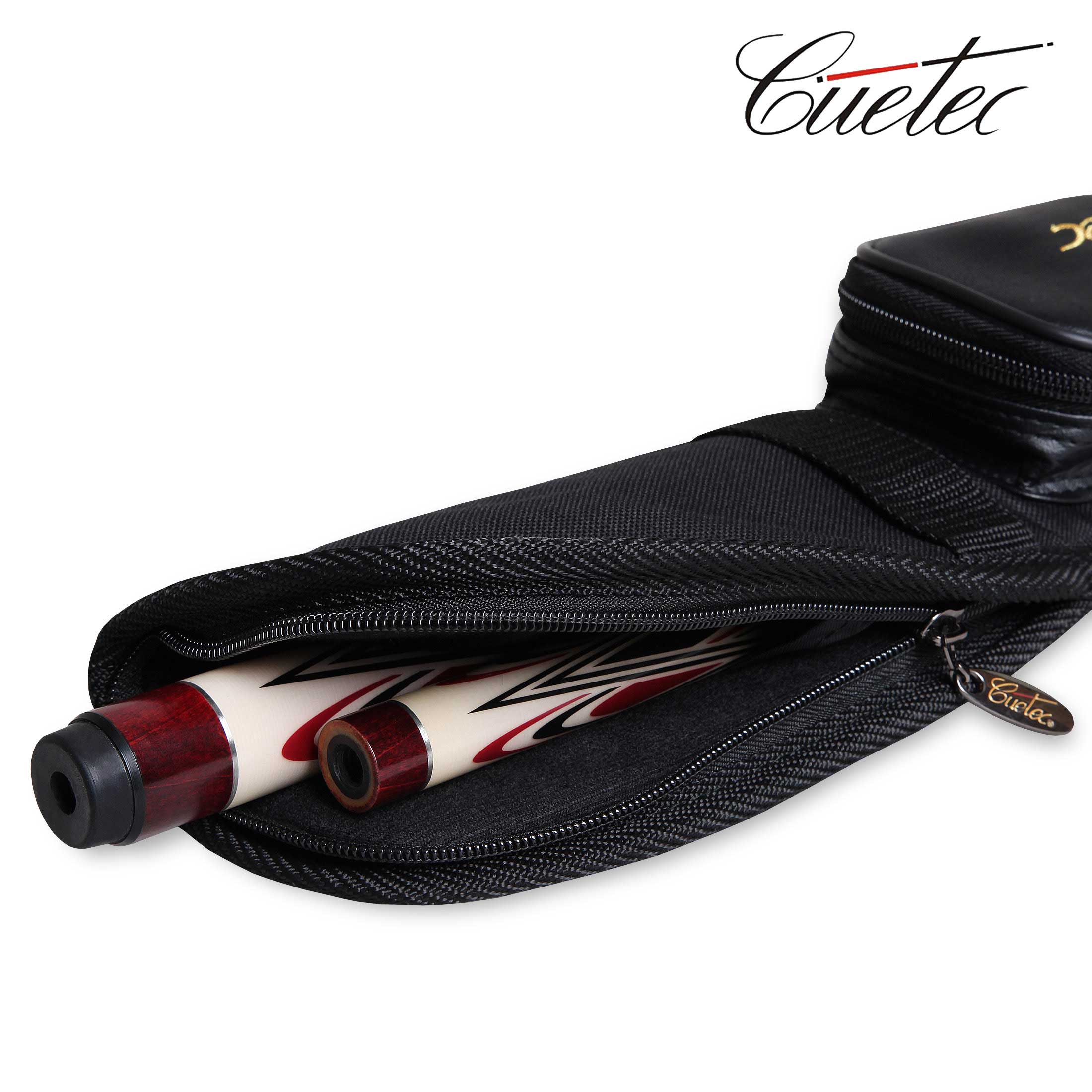 Компактный тканевый чехол для хранения и транспортировки двусоставного кия изготовлен известным американским производителем бильярдных киев и аксессуаров - компанией Cuetec Co., Ltd. Чехол застегивается по всей длине на замок-«молнию». С внешней стороны размещен непромокаемое отделение из винилового материала длиной 16 см для аксессуаров, ключей или документов, которое также застегивается на «молнию». Для транспортировки предусмотрены две рукоятки и длинный плечевой ремень. Внутренняя часть чехла, обитая мягкой и плотной ворсистой тканью, состоит из отделения для кия в разобранном виде: для шафта и турняка.